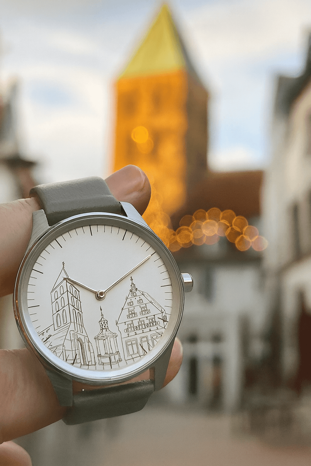 Diese Uhr zeigt drei markante Motive der Stadt: die Stadtkirche, den Falenhofbrunnen und das Haus Markt 12. Die Illustrationen sind bewusst reduziert gehalten und fügen sich in ein klares, zeitloses Zifferblatt ein. So entsteht ein sachliches Design, das lokale Architektur präzise abbildet, ohne aufdringlich zu wirken.